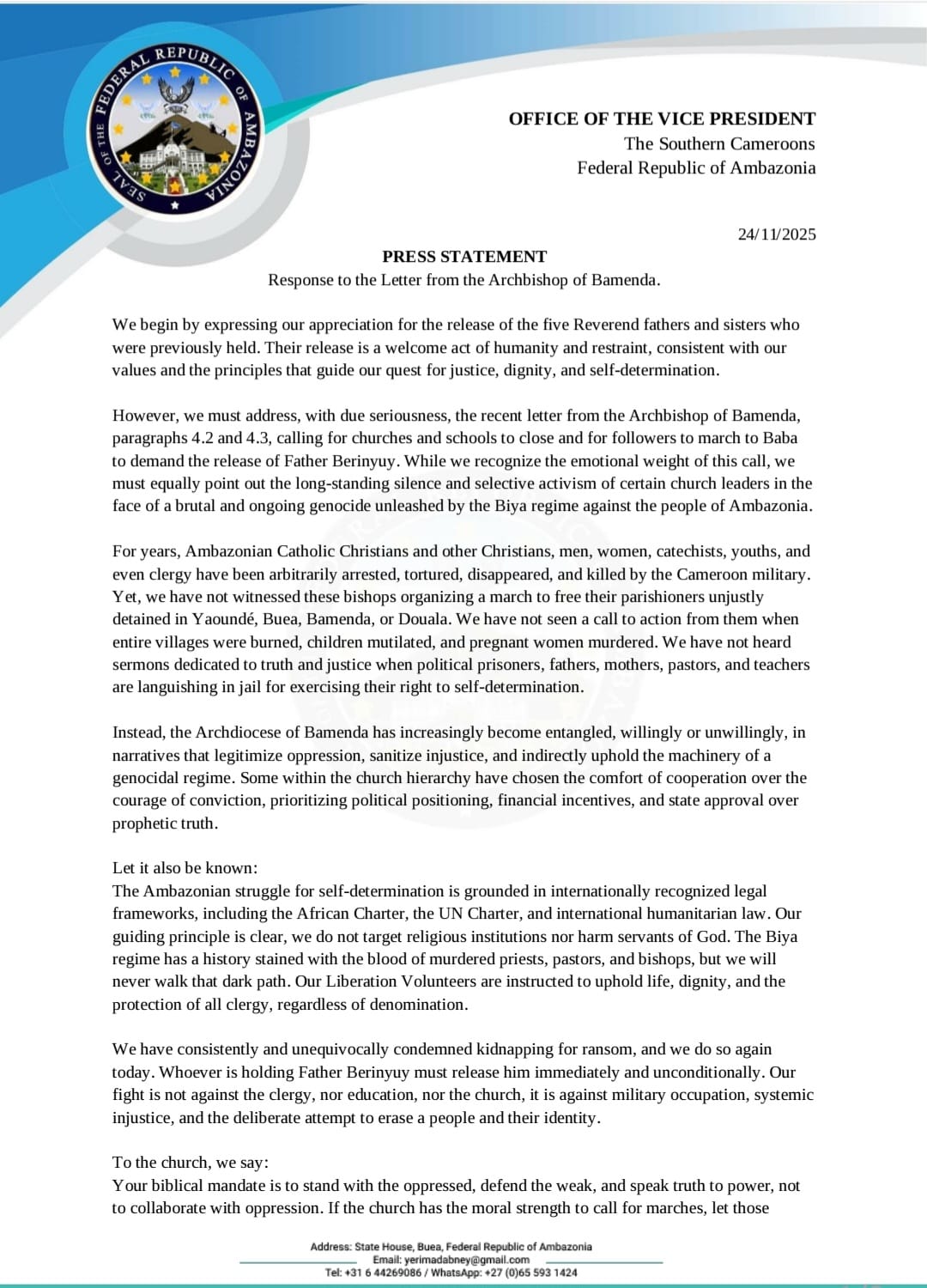 • Catholic Priest Faults Bishop Bibi’s Defence on Church’s Silence Amid Cameroon’s Worsening Crisis