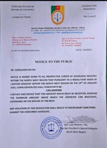in Cameroon’s North West Region have officially increased the minimum consultation fee to 100,000 FCFA for prospective clients. The new rate takes immediate effect following a resolution adopted on January 23, 2026, by advocates resident in the region.